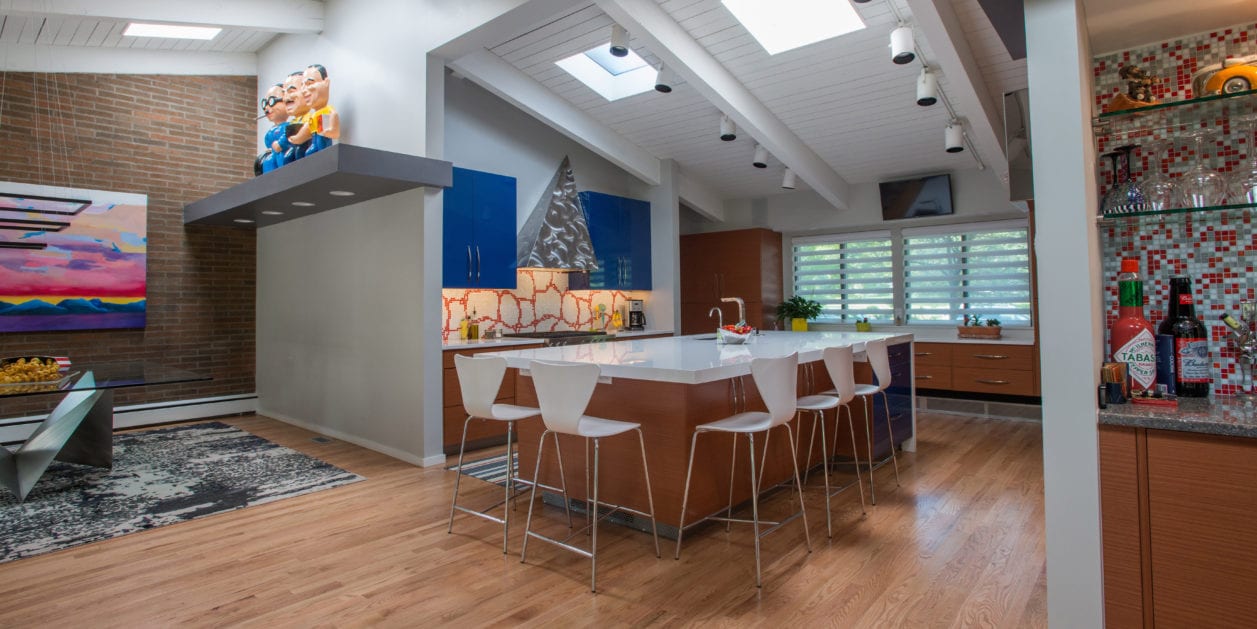 I seriously can’t get over this kitchen. I love the design, the art, the color, the mid-century inspiration, the light! I just love it all! Kim with Caruso Kitchens always brings it with her designs and this Denver home was no exception.